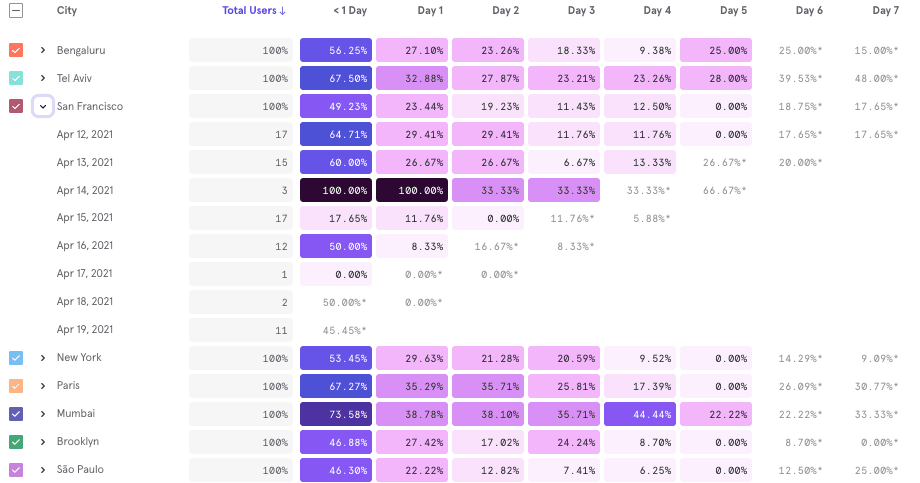 In other words, we will calculate the retention of each and every cohort based upon the selected birth interval unit (day/week/month cadence that the user performed the A action) and then summarize it into one line by taking the average of all complete buckets. You can see the retention of each individual interval by expanding the Average Retention column: